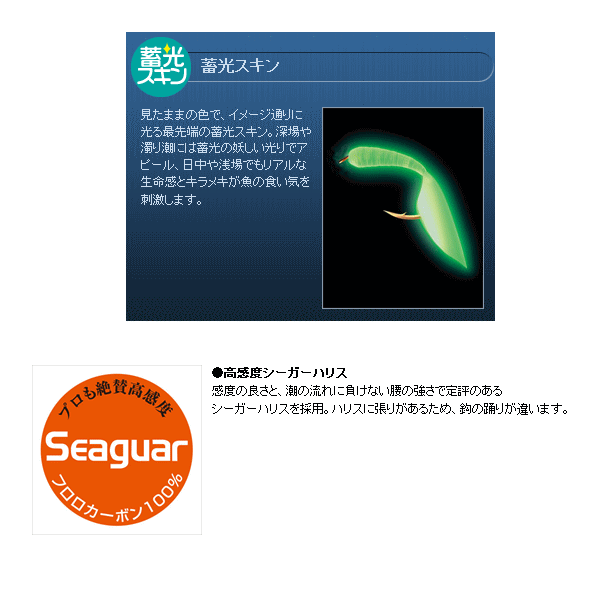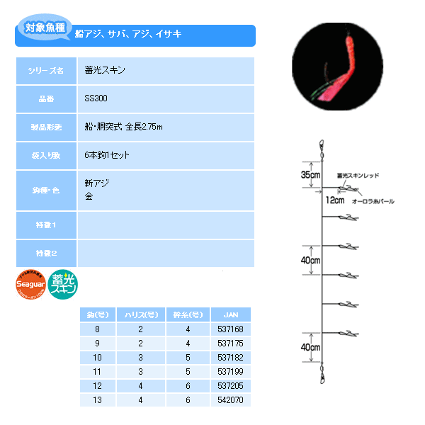 シリーズ名:蓄光スキン 品番 : SS300 製品形態 : 船・胴突式 全長2.75m 袋入り数 : 6本鈎1セット 鈎種 : 新アジ 色 : 金 対象魚 : 船アジ、サバ、アジ、イサキ ☆