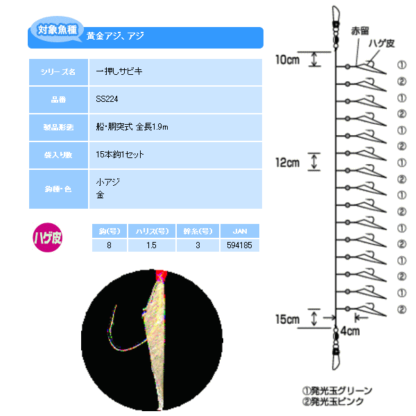 シリーズ名:一押しサビキ 品番 : SS224 製品形態 : 船・胴突式 全長1.9m 袋入り数 : 15本鈎1セット 鈎種 : 小アジ 色 : 金 対象魚 : 黄金アジ、アジ ☆